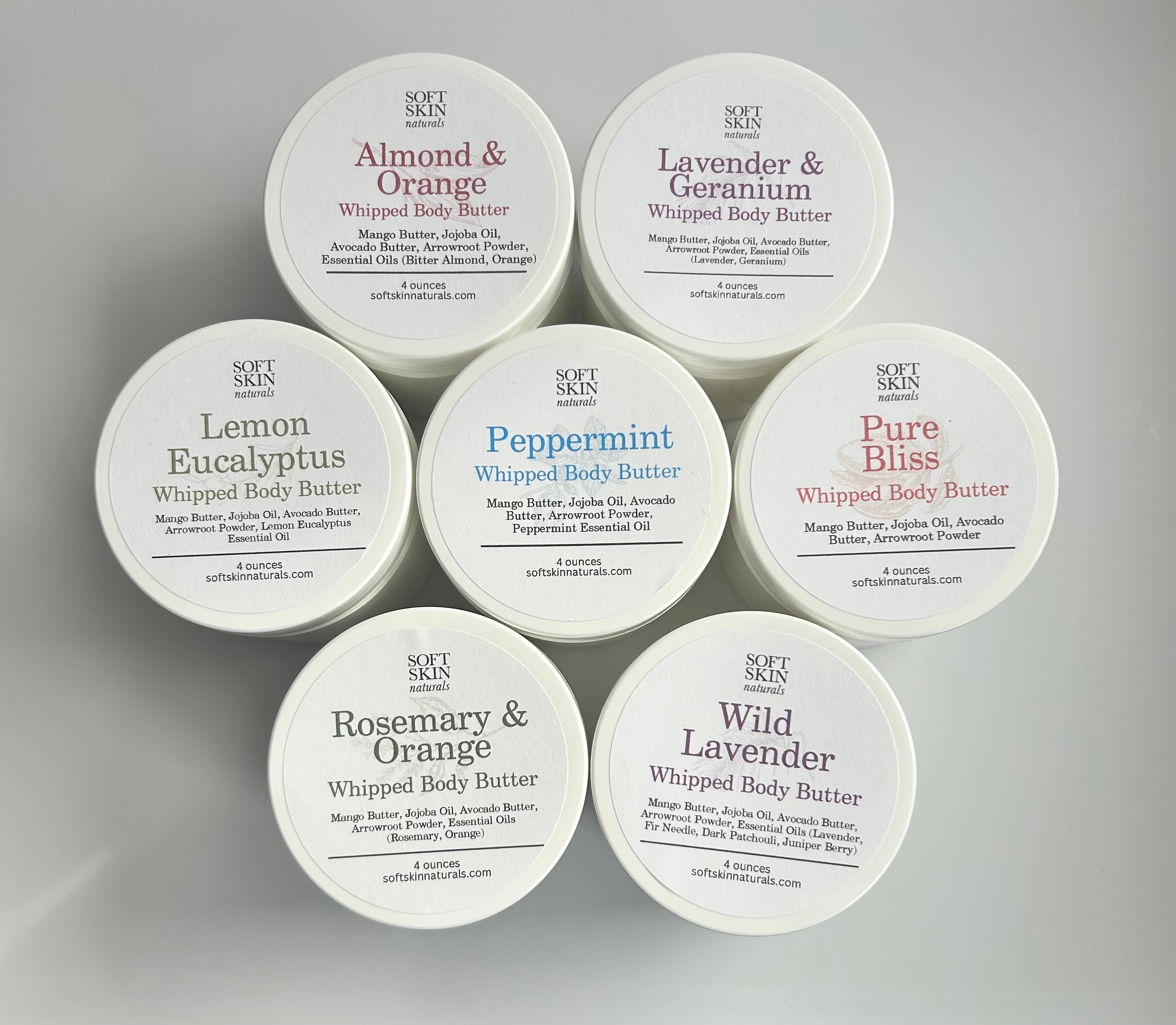 My whipped body butters are light yet deeply moisturizing, made with rich plant-based butters and oils. They melt into your skin, providing lasting hydration. The result is nourished skin that feels pampered all day long.