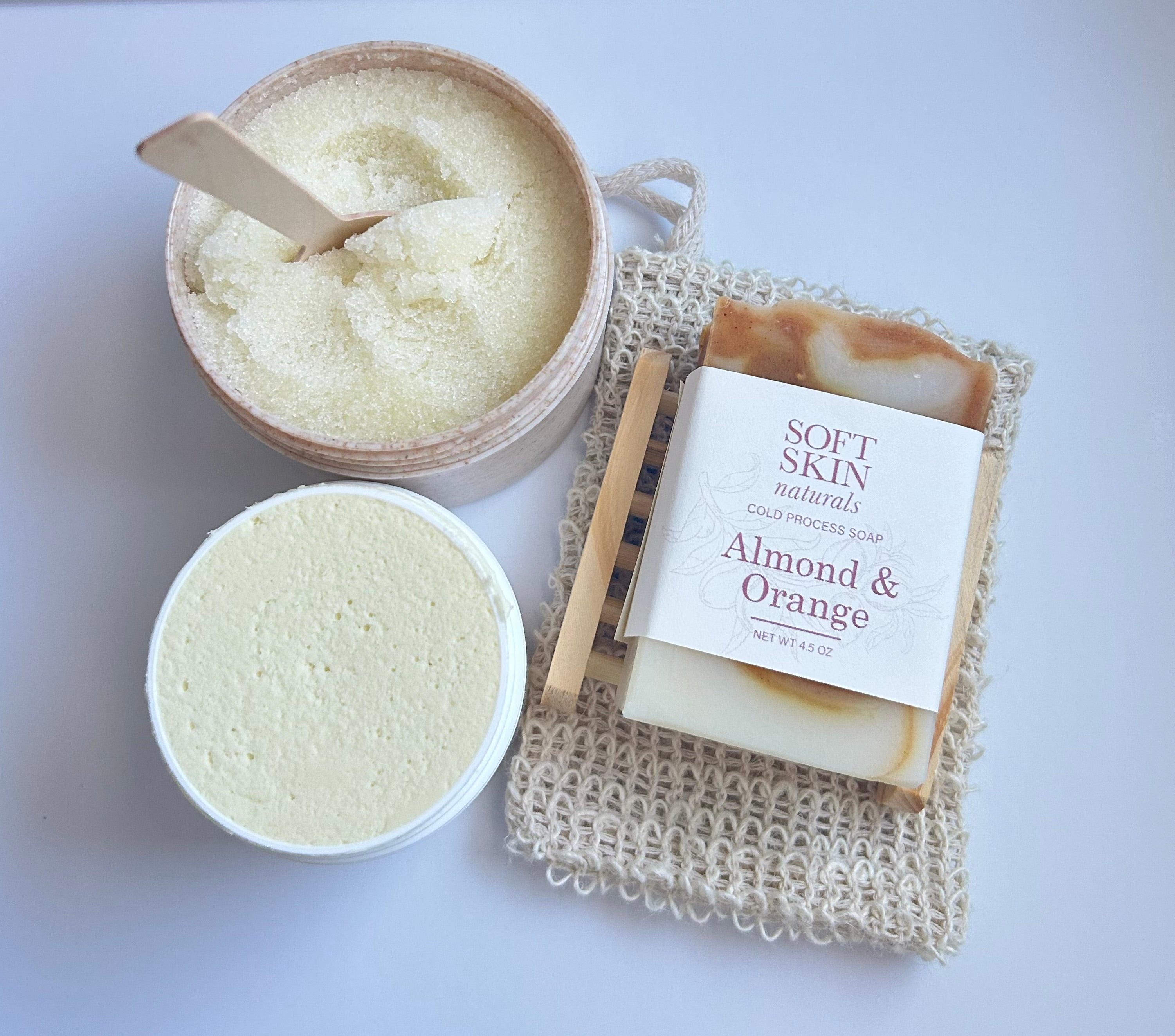 These curated gift sets feature my handcrafted soap, sugar scrub, and whipped body butter. Whether you choose soap and scrub, soap and body butter, or the full three-piece set, these gifts are designed to nourish skin and turn everyday self-care into a meaningful ritual.